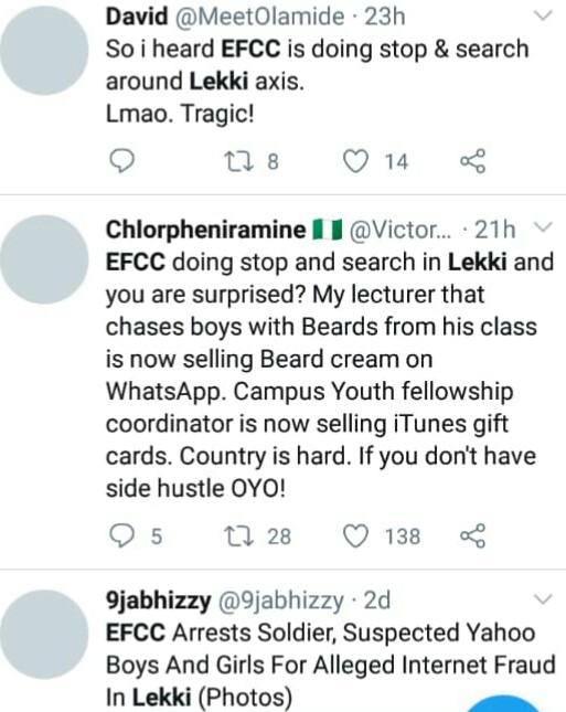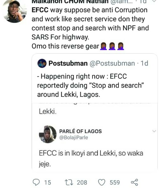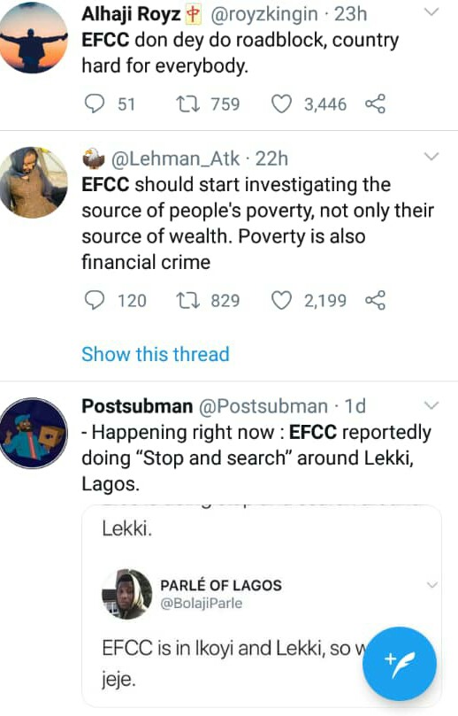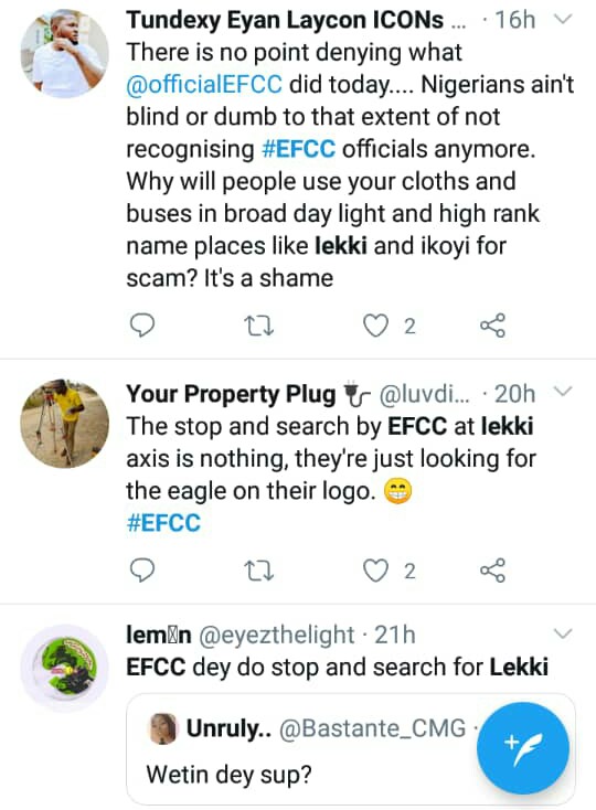 The Economic and financial crime commission has been lashed out by Nigerians after embarking on “stop” and “search” operations around Lekki Axis.