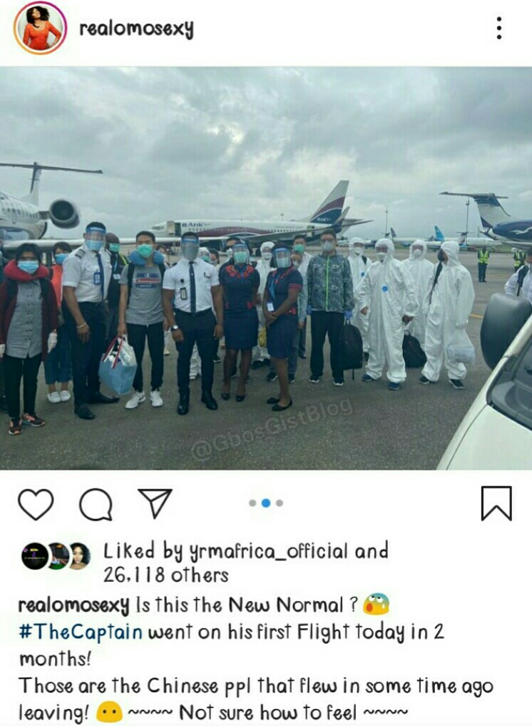 The picture shows Captain Matthew Ekeinde, the husband to the Nollywood actress standing with his colleague in company of the Chinese Medical Team that flew into the country on the 14th of April, 2020 of which their where about has generated a lot of concerns by many Nigerians including Political Parties, House of Representative, NGOs, among many others.