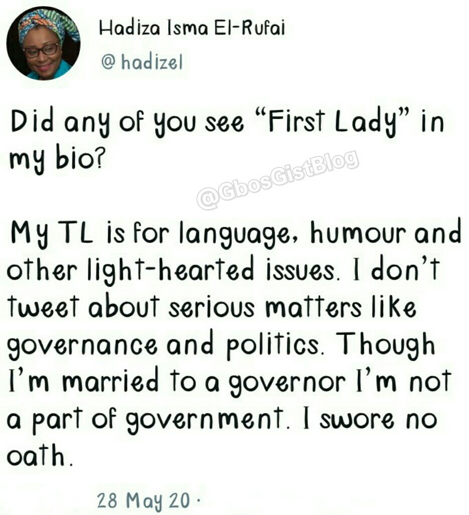 While replying, Hadiza Isma El-Rufai tweeted “Did any of you see ” First Lady” in my bio?” adding that “My TL is for language, humour and other lighthearted issues. I don’t tweet about serious matters like governance and politics. Though I’m married to a governor, I’m not a part of governance. I swore no oath.”
