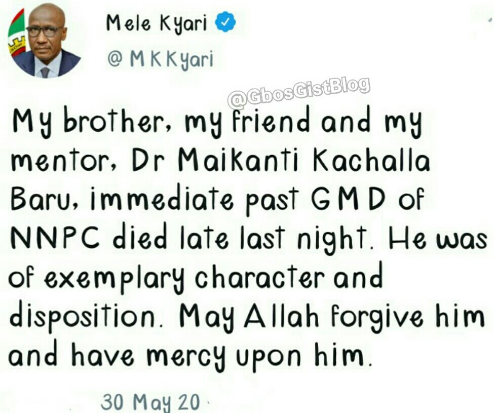 “My brother, my friend and my mentor, Dr. Maikanti Kachalla Baru, immediate past GMD of NNPC died late last night. He was of exemplary character and disposition. May Allah forgive him and have mercy upon him” he tweeted