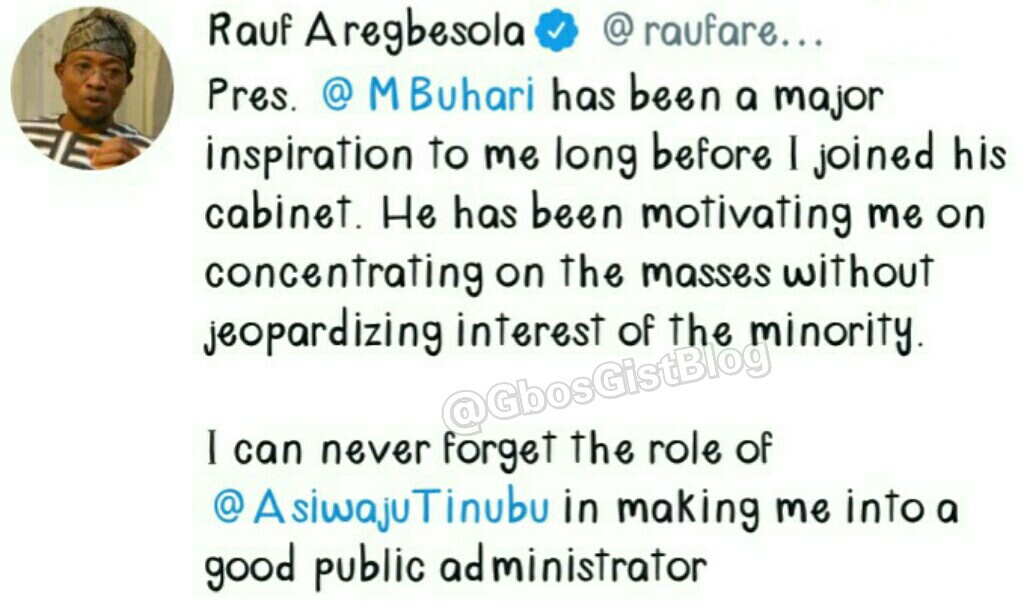 Rauf Aregbeshola tweeted ” Pres. @Mbuhari has been a major inspiration to me long before I joined his cabinet. He has been motivating me on concentrating on the masses without jeopardizing interest of the majority.”