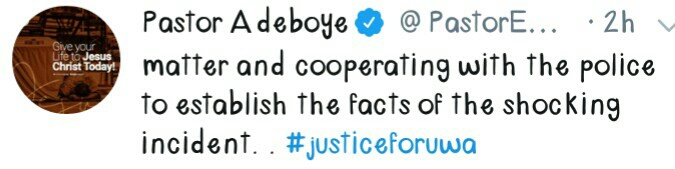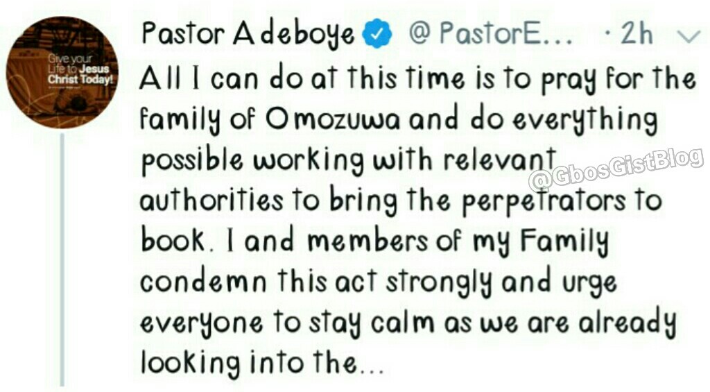 ” All I can do at this time is to pray for the family of Omozuwa and do everything possible working with relevant authorities to bring the perpetrators to book” adding that “I and members of my family condemn this act strongly and urge everyone to stay calm as we are already looking into the matter and cooperate with the police to establish the fact of the shocking incident”