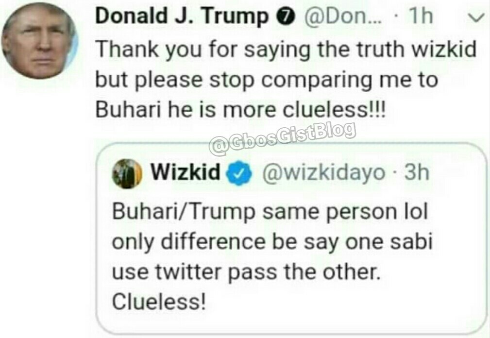 Replying Wizkid’s tweet, the America President wrote “Thank you for saying the truth Wizkid but stop comparing me to Buhari he is more clueless!!!”