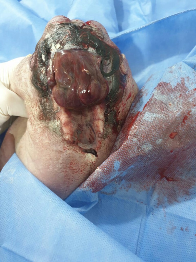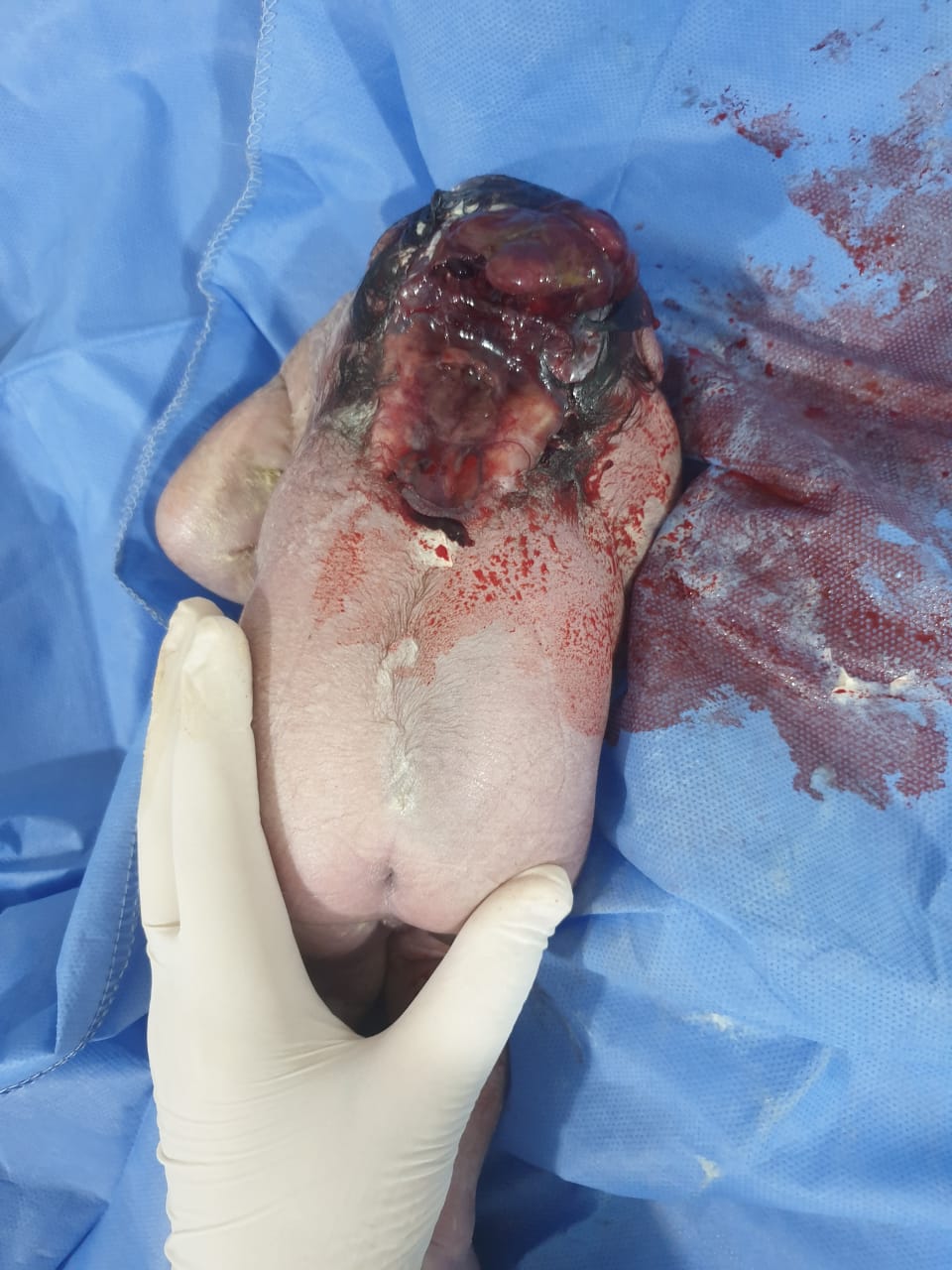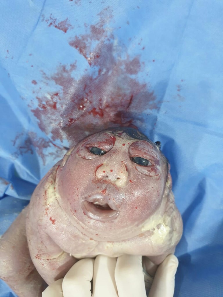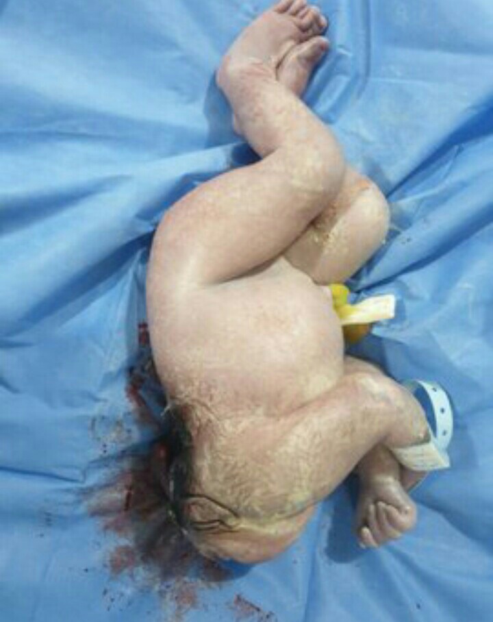 Doctors, nurses, midwives and hospital personnels on ground after delivery were thrown to a great shock when a new born baby came out of womb today with open skull living its brain falling out through the neck side.