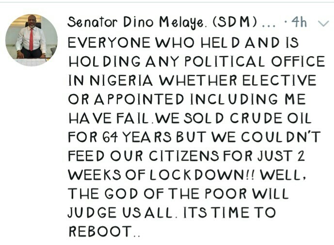 He came out boldly in his media handle tweeting ” EVERYONE WHO HELD AND IS HOLDING ANY POLITICIAL OFFICE IN NIGERIA WHETHER ELECTIVE OR APPOINTED INCLUDING ME HAVE FAIL. WE SOLD CRUDE OIL FOR 64 YEARS BUT WE COULDN’T FEED OUR CITIZENS FOR JUST 2 WEEKS LOCKDOWN!! WELL, THE GOD OF THE POOR WILL JUDGE US ALL. ITS TIME TO REBOOT ” —Dino Melaye says