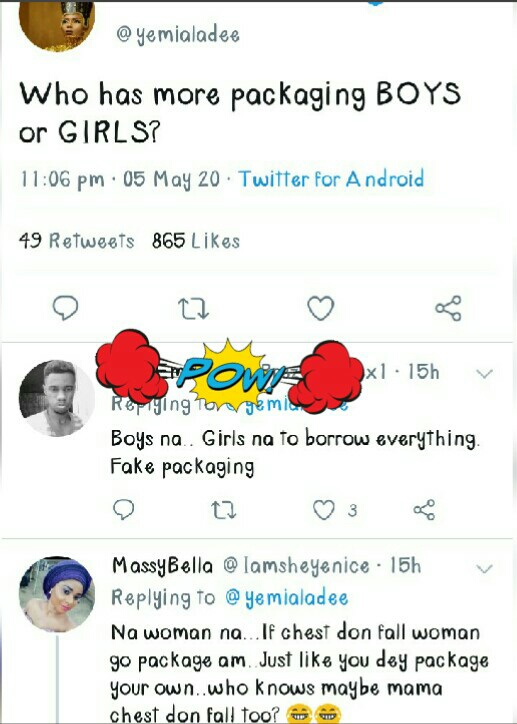 “Na woman na…If chest don fall woman go package am Just like you dey package your own…”
