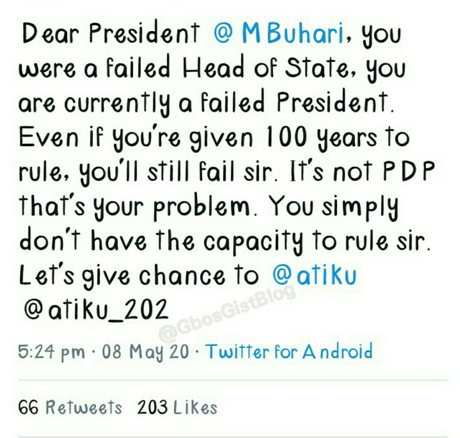 His tweet reads”Dear President @MBuhari, you were a failed Head of State, you are currently a failed President, Even if you’re given 100 years to rule, you” ll still fail sir. You simply don’t have the capacity to rule sir.”