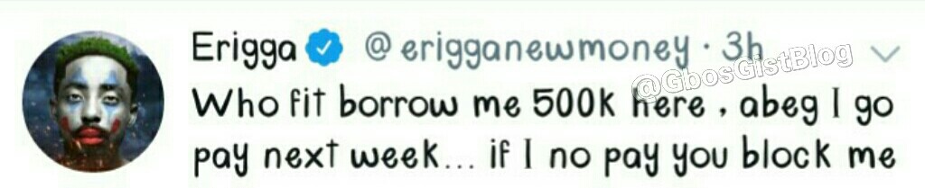 The Warri born rapper, Erhiga Agarivbe popularly known as Erigga, took to his Twitter page on Sunday pleading his fans to lend him N500,000, promises to pay back in due time.