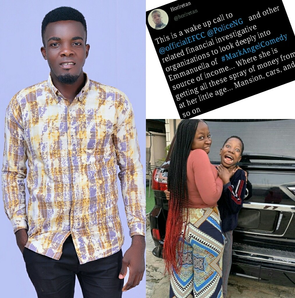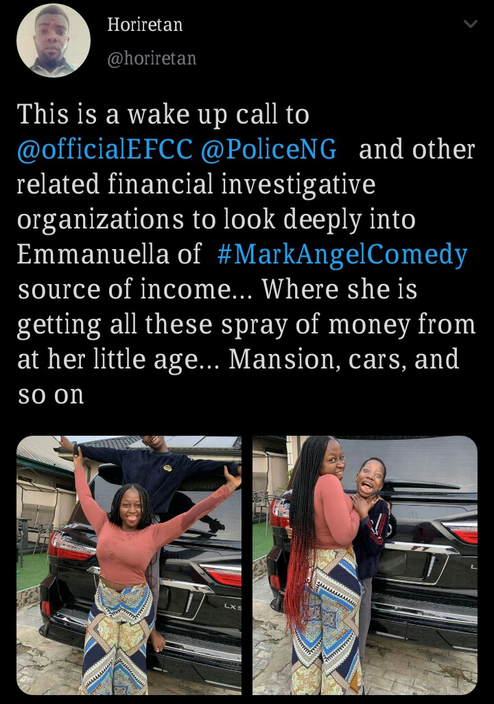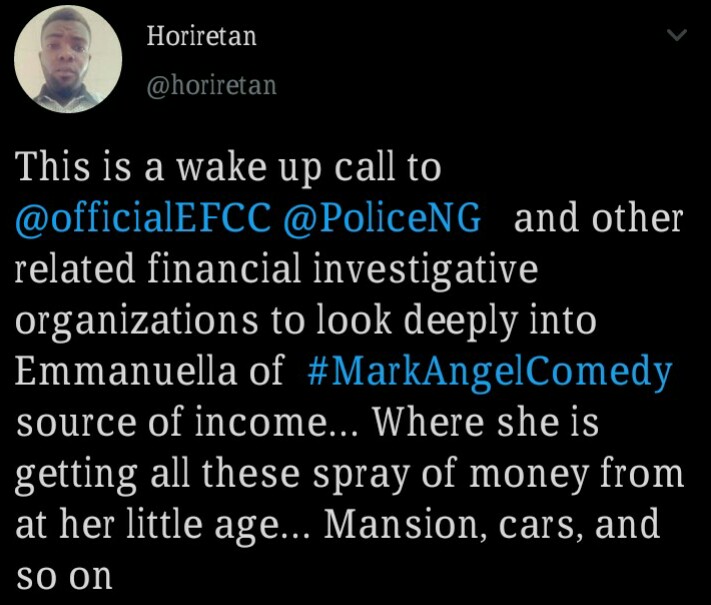 This is coming after the popular upcoming actor who doubled as a road-show promoter, Oriretan Honour through his twitter handle “@horiretan” on Wednesday, 3rd of February said the little Emmanuella of MarkAngelComedy source of wealth should be investigated.