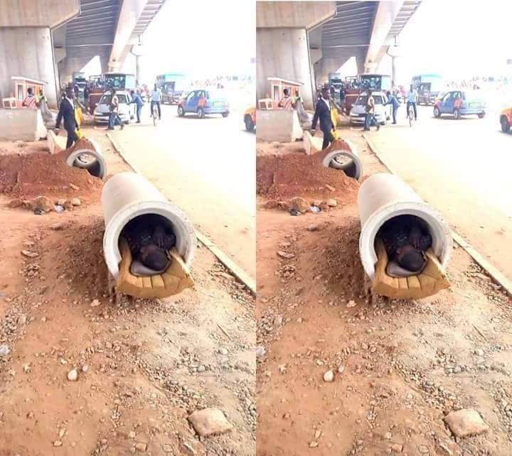 Confirming this photo, a facebook user said when he was living for work very early in the morning some days back in Port Harcourt, he saw a man dark in complexion (probably this same man) pulling out matrass from one of the culvert under the the flyover but never knew if that was where he slept not until his photo surfaced online.